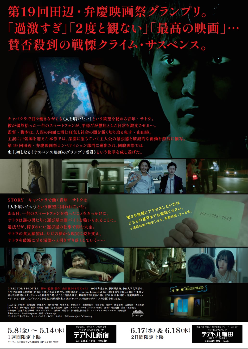 然拾った一台のスマートフォンが、平穏だが鬱屈とした日常を激変させる...。監督・脚本は、人間の内面に潜む狂気と社会の闇を鋭く切り取る鬼才・山田純。主演に戸張瞬を迎えた本作では、深淵に堕ちていく主人公の緊張感と破滅的な衝動を鮮烈に描写。第19回田辺・弁慶映画祭コンペティション部門に選出され、同映画祭では史上初の《サスペンス映画のグランプリ受賞》という快挙を成し遂げた。